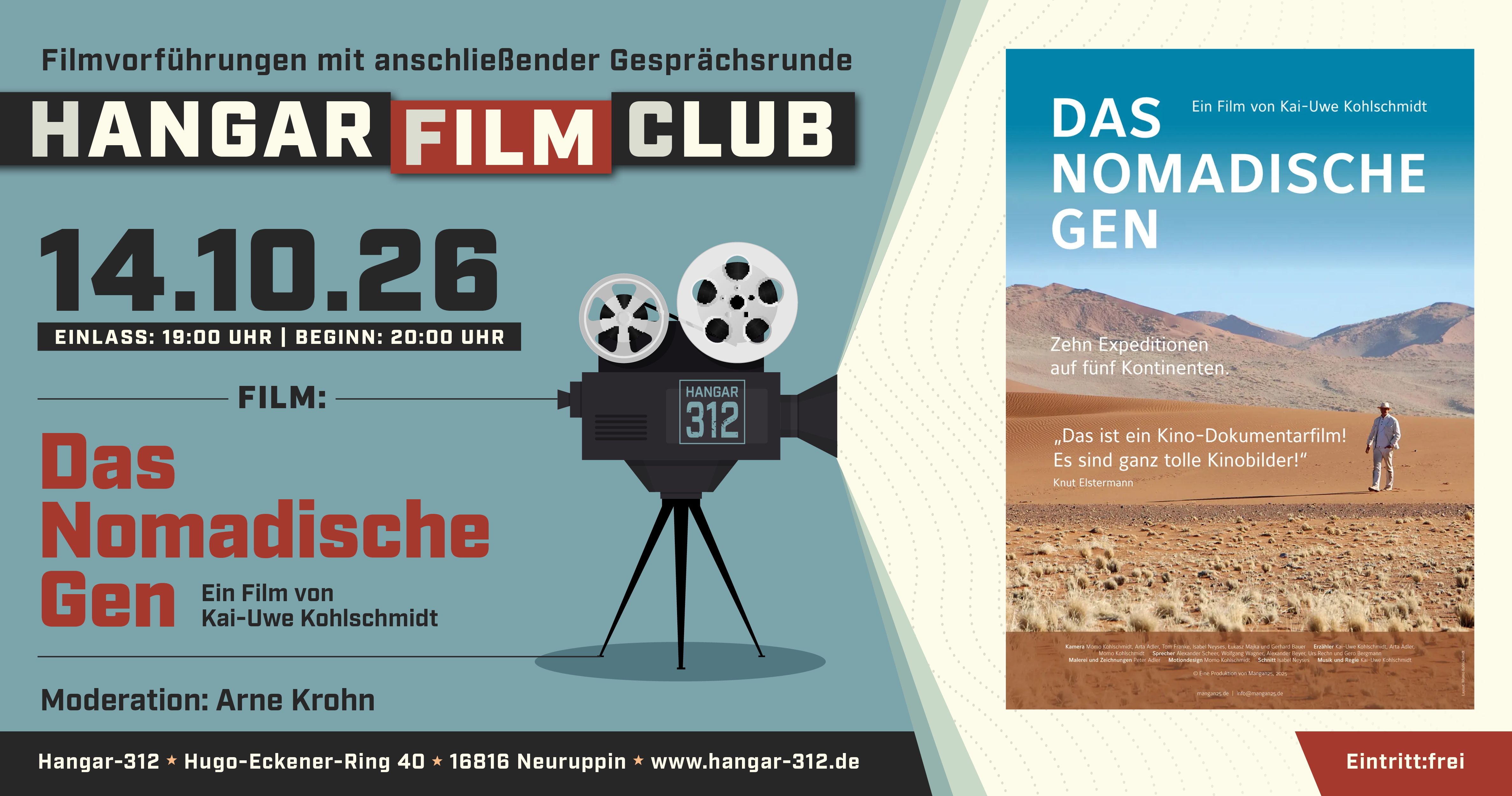 Besuche den den Hangar-312 Film Club! Erlebe fesselnde Filme und spannende Diskussionen mit Filmemachern, moderiert von Arne Krohn. Der Eintritt ist frei, Spenden können hinterlassen werden.